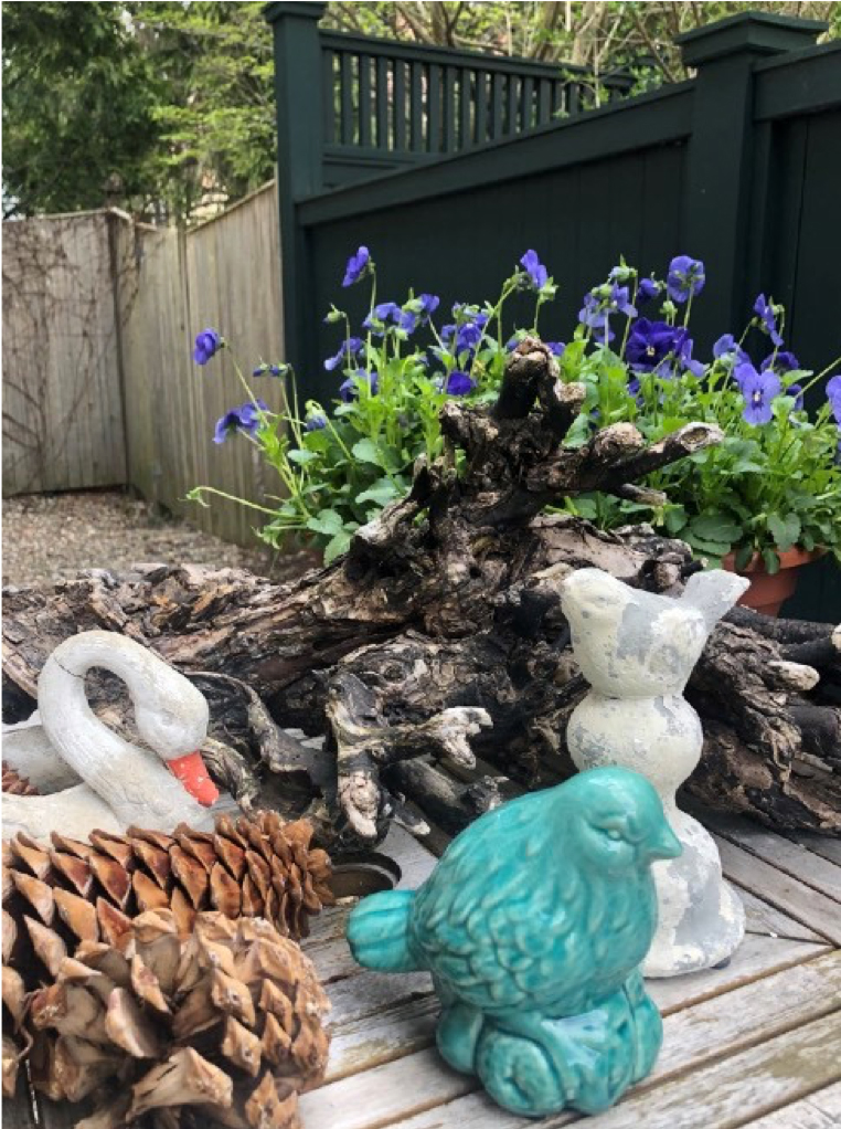 Groupings let you have a little of this and a little of that. As a rule of thumb, groupings tend to like odd numbers – groups of three items, or of five items for example. You usually need one thing with some height, so don't be afraid to stack. Put a squat pansy plant on top of a stack of books, or even on top of another upside-down pot. Honestly, be a scavenger in your own home. I know you'll find lots of good stuff. Add some candles, a delicate little bird's nest you found on a walk, maybe a wine glass stuffed with clover, a stack of sand dollars, or a silly "think spring" sign someone gave you at work. Anything goes! If it starts looking like a big mess, take a step back and simplify. And sometimes it can help to put it all on a tray or a round platter.